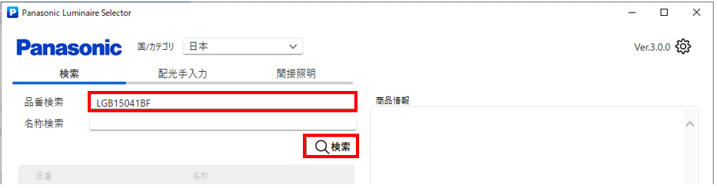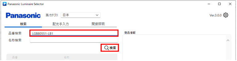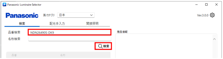 1. 照明器具検索ダイアログが起動しますので、品番を入力、ボタンをクリックします。