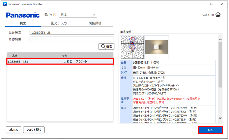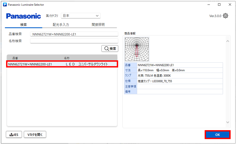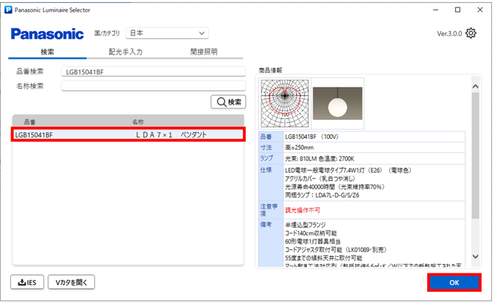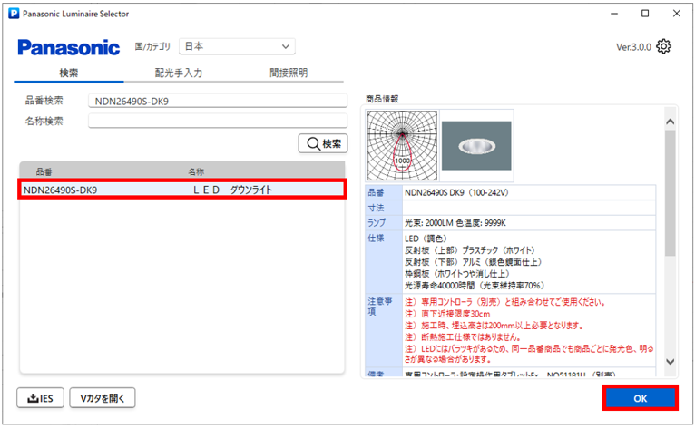 1. 選択した照明器具の内容が表示されますので、確認の上「OK」をクリックします。