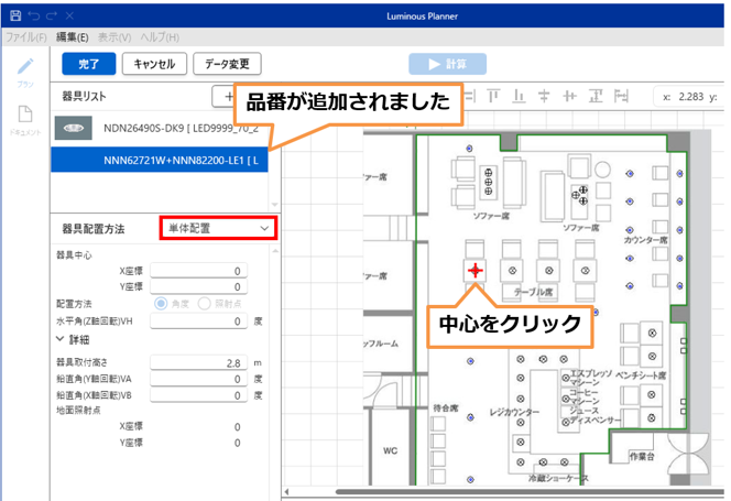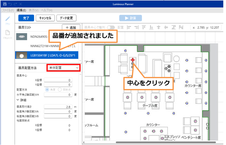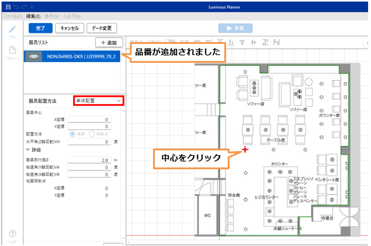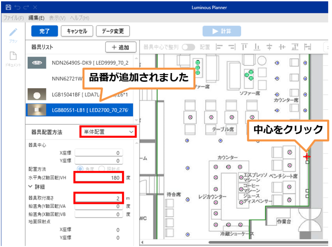 続けて、[器具配置方法]の「単体配置」を選択し、「水平角」「器具取付高さ」を変更し、