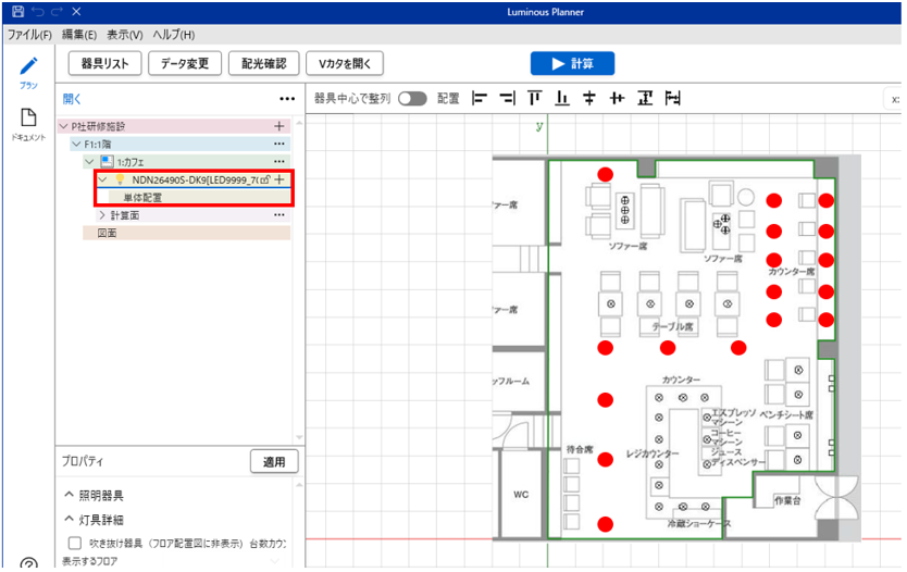 1. 器具が配置されました。※下図、赤色のが配置したダウンライトになります。