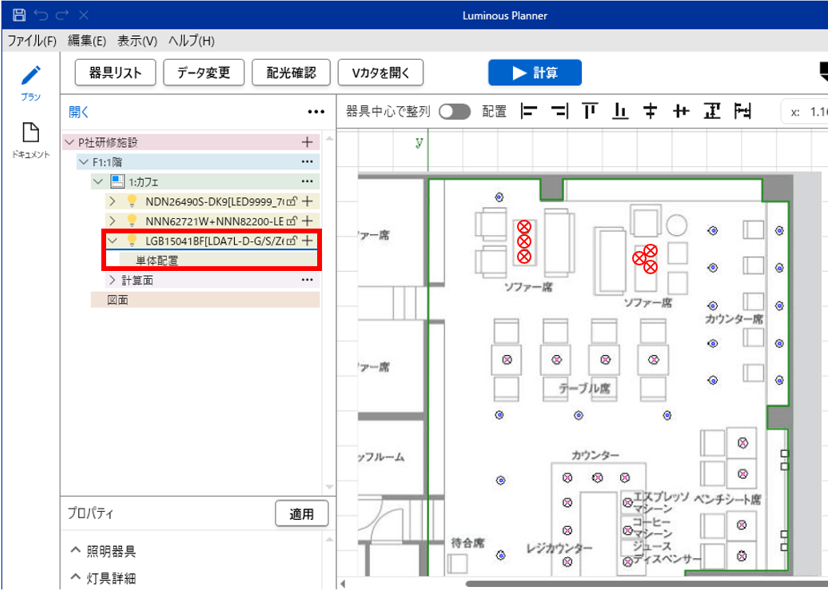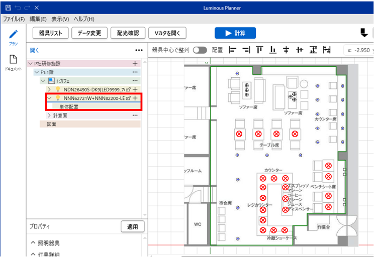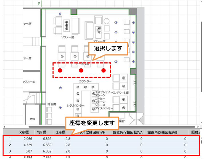 図面上の器具を選択すると該当器具の座標がフォーカスされますので、値を変更します。