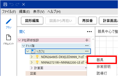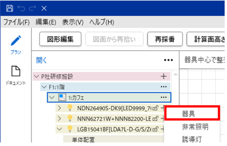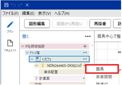 このチュートリアルでは、器具種類ごとに選択、配置を行いますが、連続して別種類の器具を配置することも可能です。