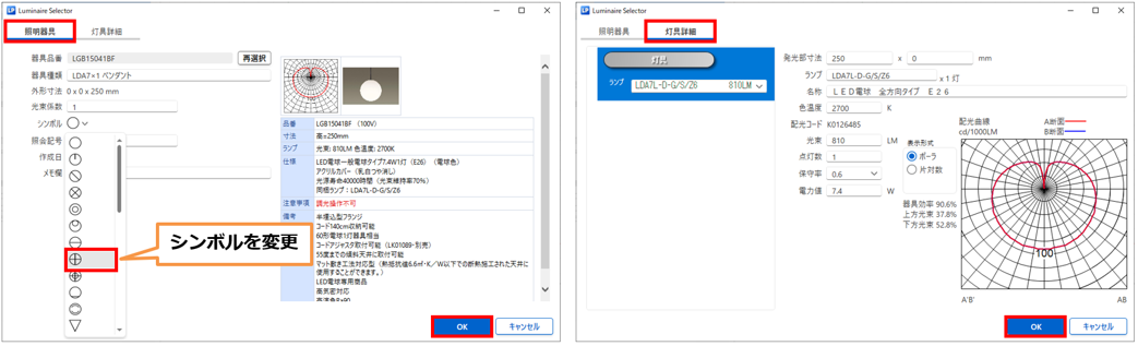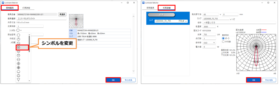 1. 【照明器具】タブにあります「シンボル」をに変更後、【灯具詳細】タブの内容を確認し、「OK」をクリックします。