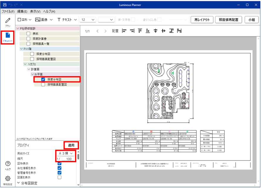 ※プロパティから「用紙サイズ」「縮尺」等を入力し、「適用」をクリックしますと、レイアウトが変更できます。