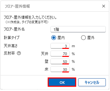 - [フロア・屋外情報]ダイアログが開きますので、次のように設定します。