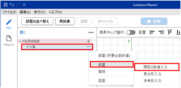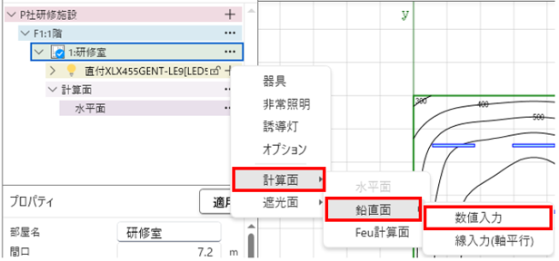 「部屋」(例:研修室)の「…」をクリックし、[計算面]-[鉛直面] -[数値入力]を選択します。
