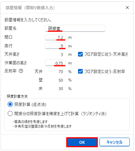 - [部屋情報(間取り数値入力)]ダイアログが開きますので、次のように入力し、「OK」をクリックします。