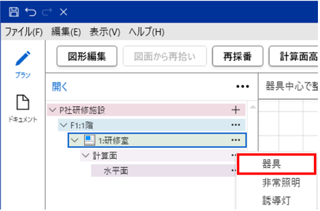 続けて、照明器具を配置します。「研修室」にある「…」をクリックし、「器具」を選択します。