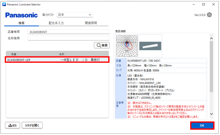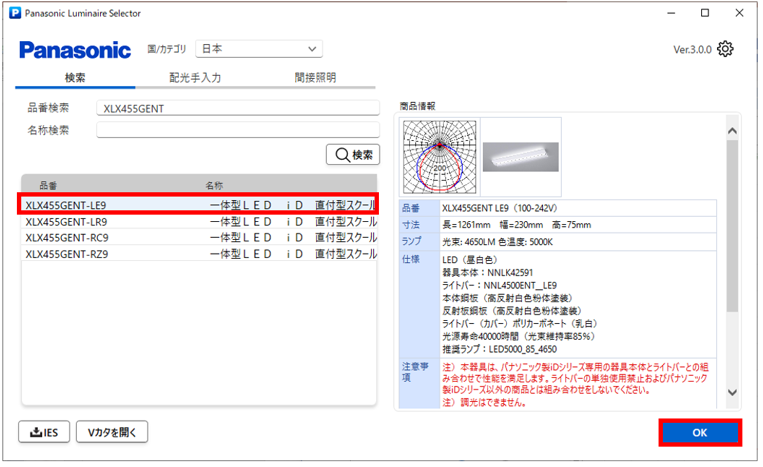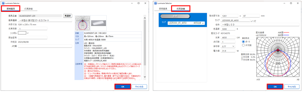 - 選択した照明器具の内容が表示されますので、確認の上「OK」をクリックします。