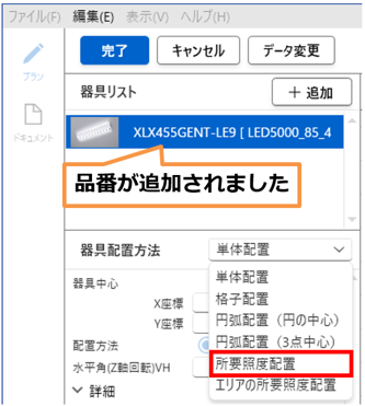 続けて、[器具配置方法]のプルダウンから、「所要照度配置」を選択します。