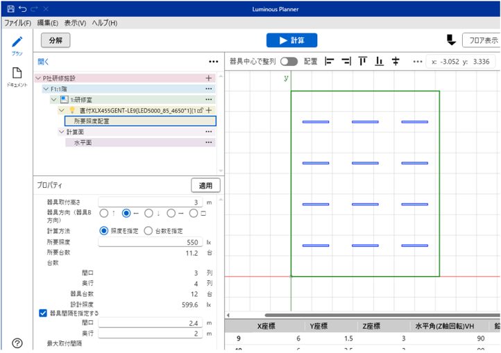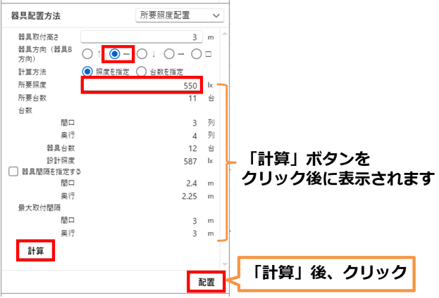 - 「器具方向」「所要照度」を次のように入力し、「計算」ボタンをクリックして、