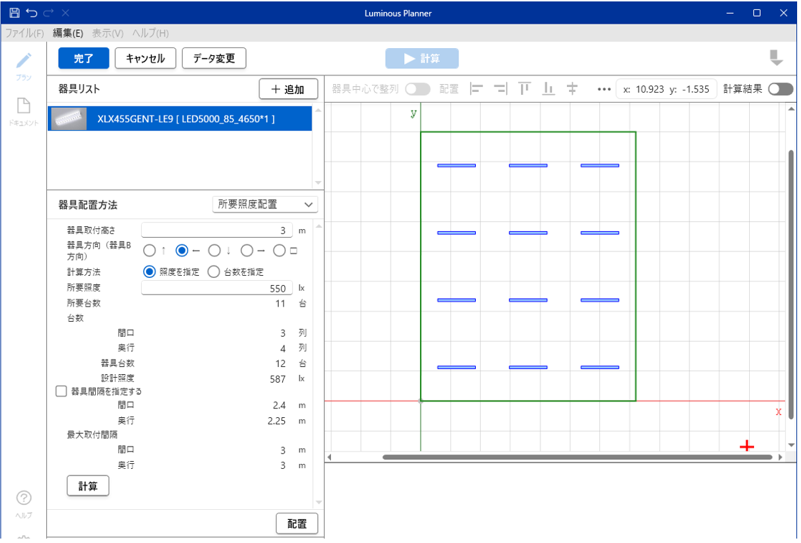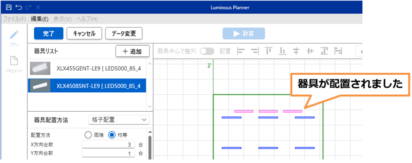 器具台数や設計照度を確認後、「配置」をクリックします。