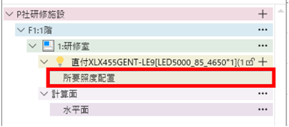 ツリーの器具品番にある▼をクリックして展開し、「器具配置方法」(例:所要照度配置)を選択します。
