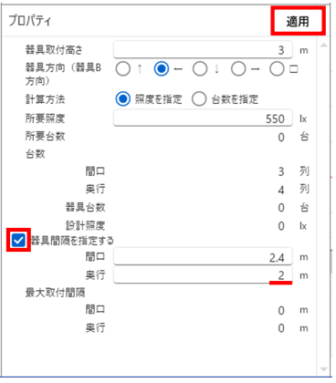 奥行の値を変更し(例:2m)、「適用」をクリックします。