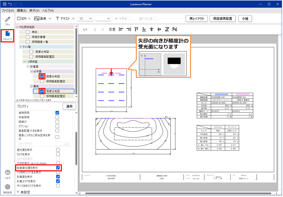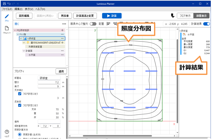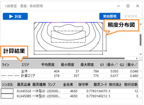 - 計算結果が表示されます。鉛直面の照度分布図を確認するには、フローティング画面で確認します。