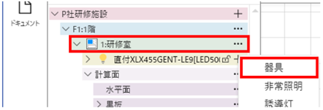 - 黒板灯の品番を追加します。「部屋」(例:研修室)の「…」をクリックし、「器具」を選択します。