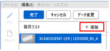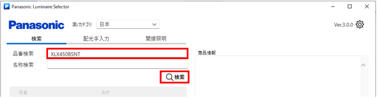 - 照明器具検索ダイアログが起動しますので、品番を入力、