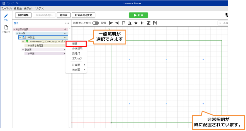 ※部屋の作成~非常用照明の配置は【3.7 非常用照明の照度計算】の手順1~13までをご参照ください。