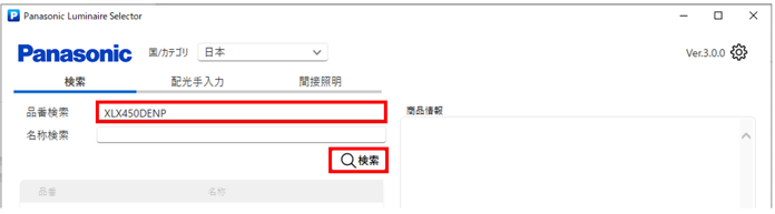 - 照明器具検索ダイアログが起動しますので、品番を入力し