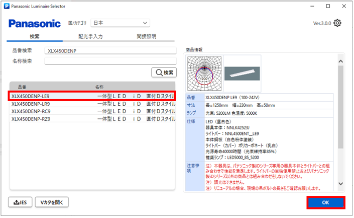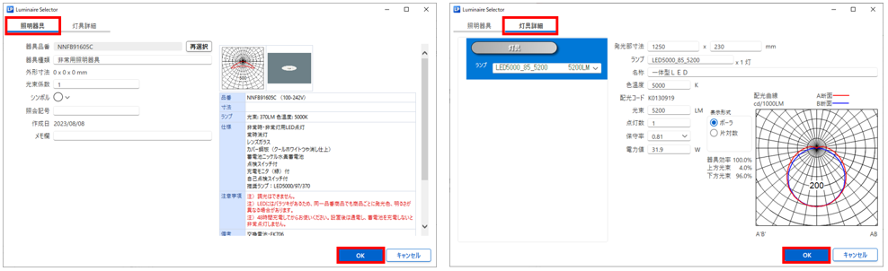 - 選択した照明器具の内容が表示されますので、確認の上「OK」をクリックします。