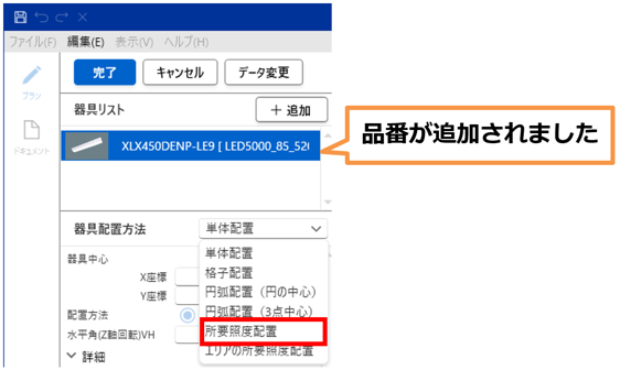 続けて、[器具配置方法]のプルダウンから、「所要照度配置」を選択します。