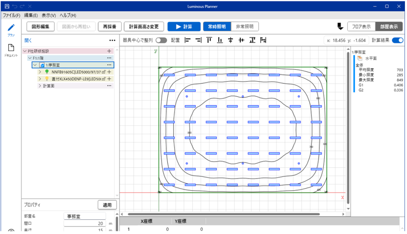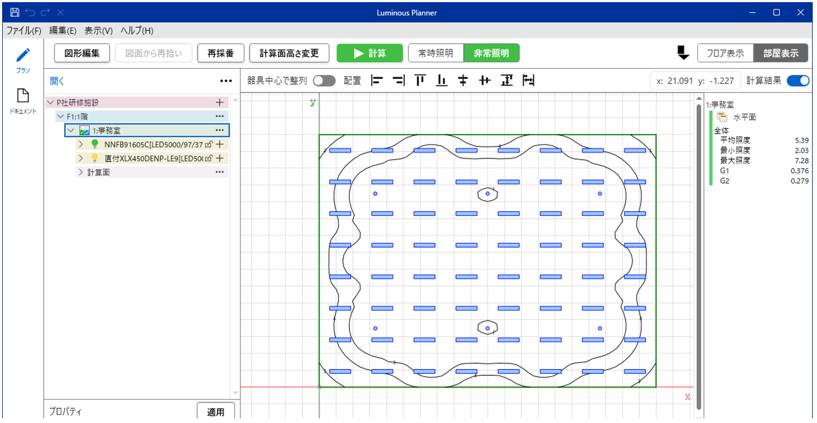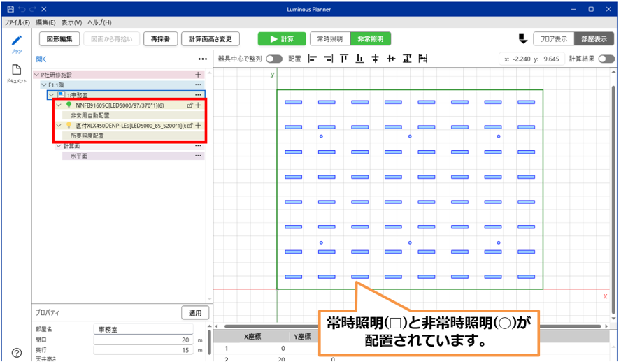 すでに非常用照明が配置されている部屋に対して、常時照明を配置し、それぞれの床面の照度を求めます。