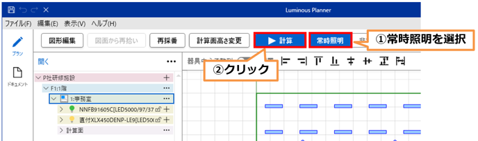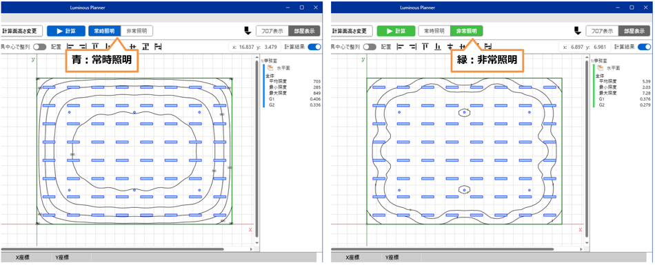 - 常時照明の計算結果と非常用照明の計算結果の画面を切り替える場合は、「常時照明」「非常照明」ボタンで切り替え確認します。