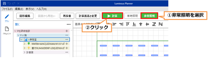 - 非常用照明の計算を行う場合は、「非常照明計算」ボタンをクリックして計算を行います。