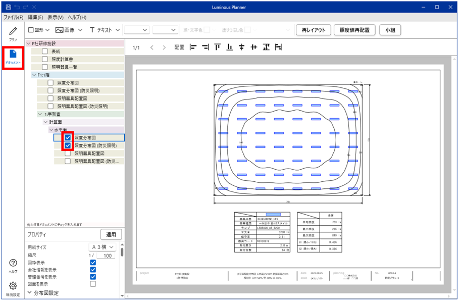 「照度分布図」と「照度分布図(非常照明)」にチェックを入れ、「ファイル」-「印刷」で印刷します。