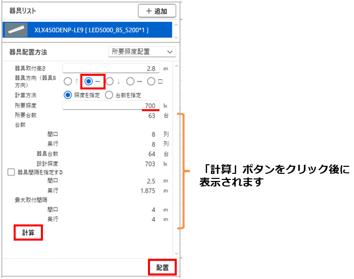 - 「器具方向」「所要照度」を次のように入力し、「計算」ボタンをクリックして、