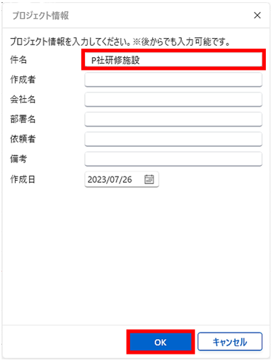 2. [プロジェクト情報]ダイアログが開きますので、「件名」(例:P社研修施設)を入力し「OK」をクリックします。