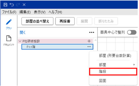 「フロア」(例:1階)の「…」をクリックし「階段」を選択します。