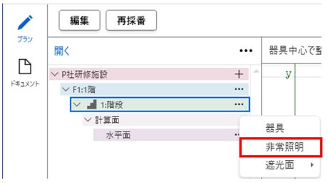「階段」にある「…」をクリックし、「非常照明」を選択します。
