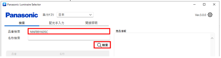 - 照明器具検索ダイアログが起動しますので、品番を入力し