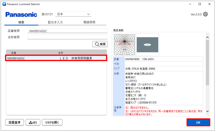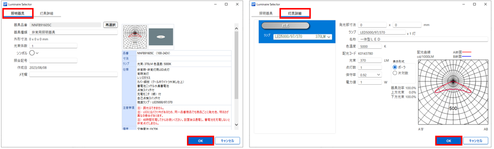 - 選択した照明器具の内容が表示されますので、確認の上「OK」をクリックします。