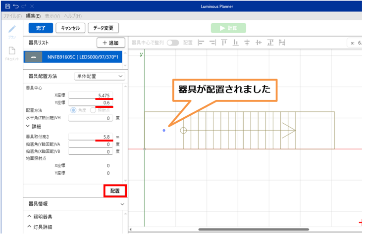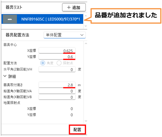 器具中心座標と取付高さを変更し、「追加」をクリックします。