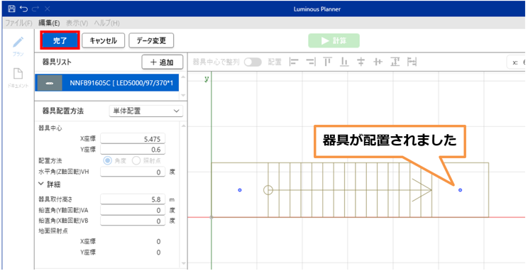 - 上階の天井にも器具が配置できました。「完了」をクリックします。