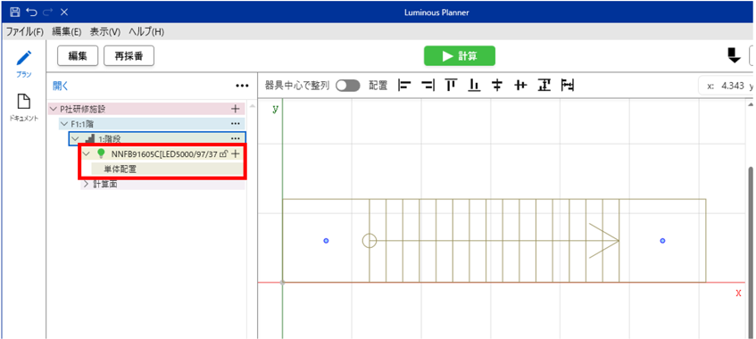 ツリーには、階段と配置した非常用照明器具品番が追加されています。