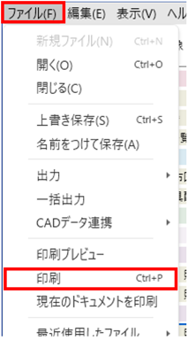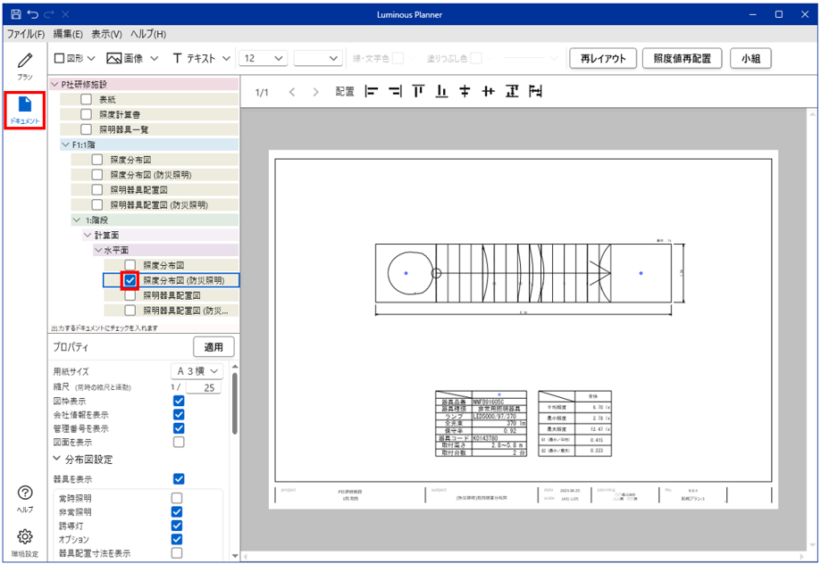 「照度分布図(非常照明)」にチェックを入れ、「ファイル」-「印刷」で印刷します。
