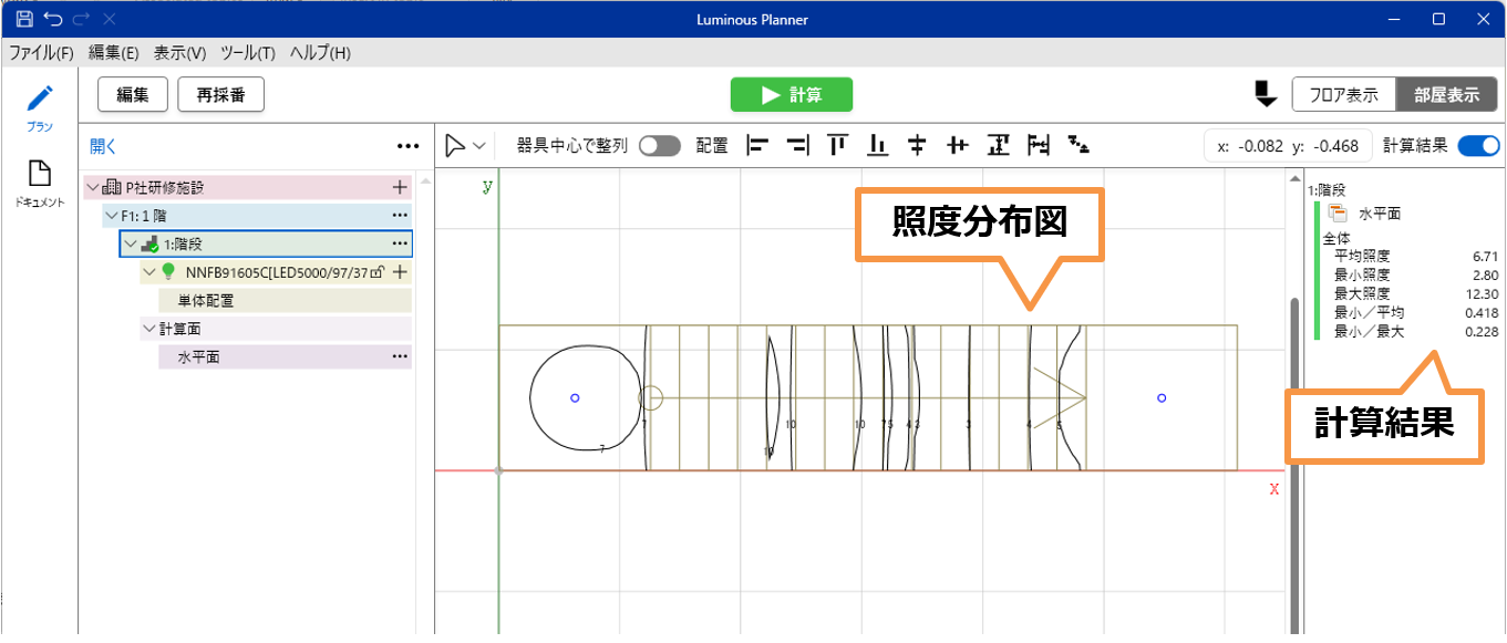 - 照度分布図が作成されました。計算結果を確認します。