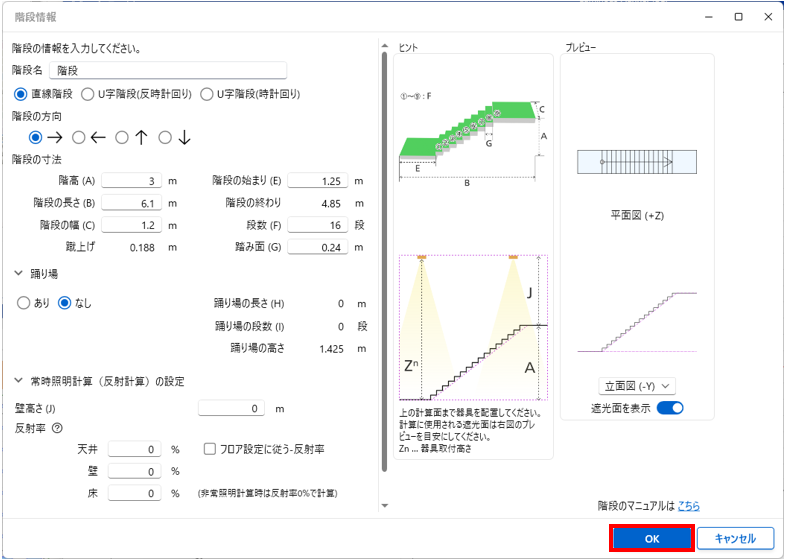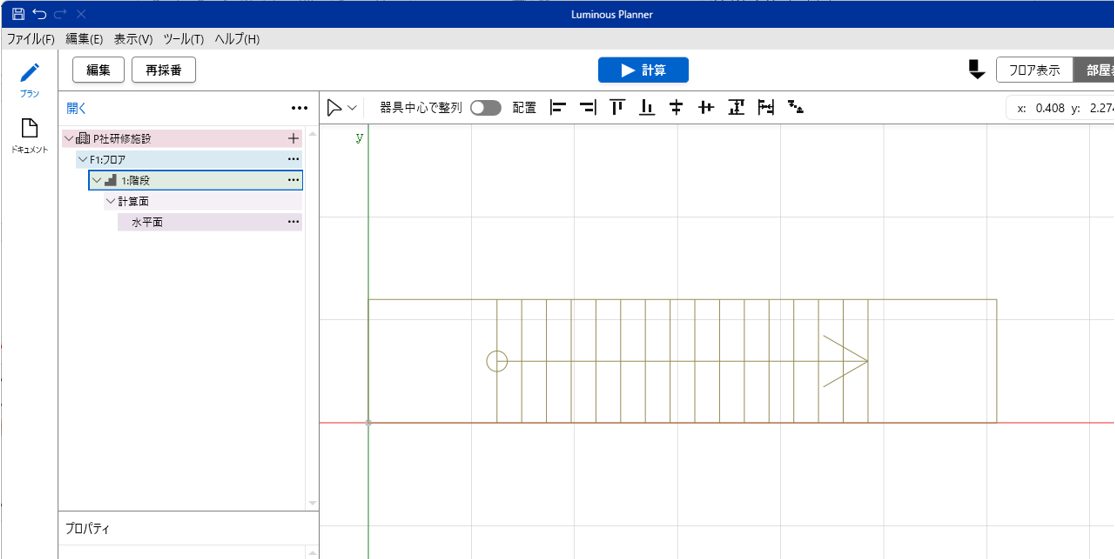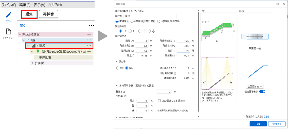 ■ご注意 ルミナスプランナー8.1から階段の照度計算方法を変更しています。 旧バージョン(ルミナスプランナー8以下のバージョン)と計算結果が異なる場合がございます。 |