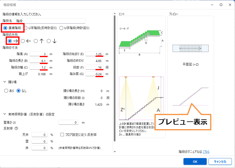 階段の各部寸法を入力すると「階段の終わり」と「蹴上げ」の値が、自動計算されます。