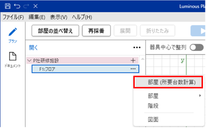 フロア「…」→「部屋(所要台数計算)」を選択します。
