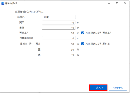 :天井、壁、床の反射率を%で入力します。