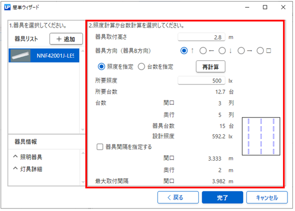 :「台数」に間口・奥行の各方向に対して器具の配列数を指定することで設計照度を計算します。