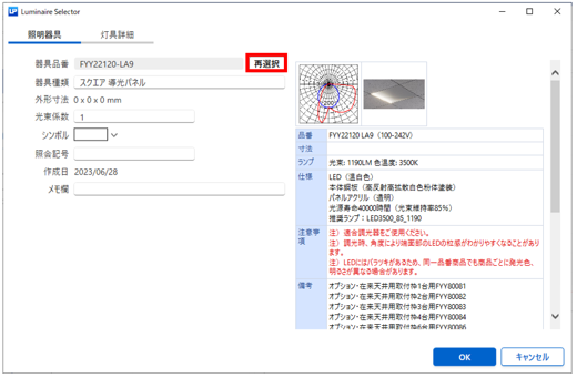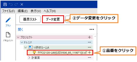第4章 プラン編集4.10 照明器具/選択方法 データ変更 既に設定している照明器具を別の品番に変更することができます。 ツリーから、部屋/スペース(例:研修ルームA)をクリックし変更前の品番をクリックします。 「データ変更」をクリックします。 照明器具検索ダイアログより「再選択」をクリック、照明器具を検索し「OK」をクリックします。