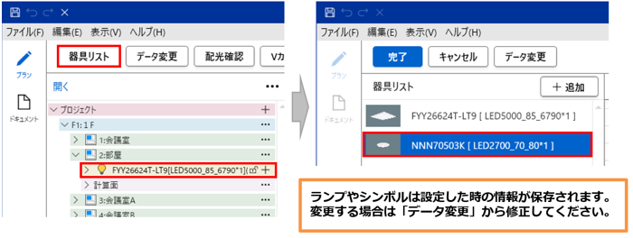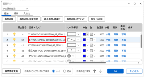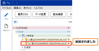 器具リスト画面で検索後、「OK」した照明器具が追加されます。他の保存ファイルへはコピーできません。
