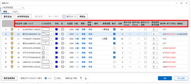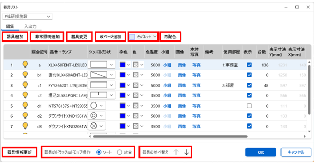 :一括で器具リスト内の器具シンボルの色を変更できます |