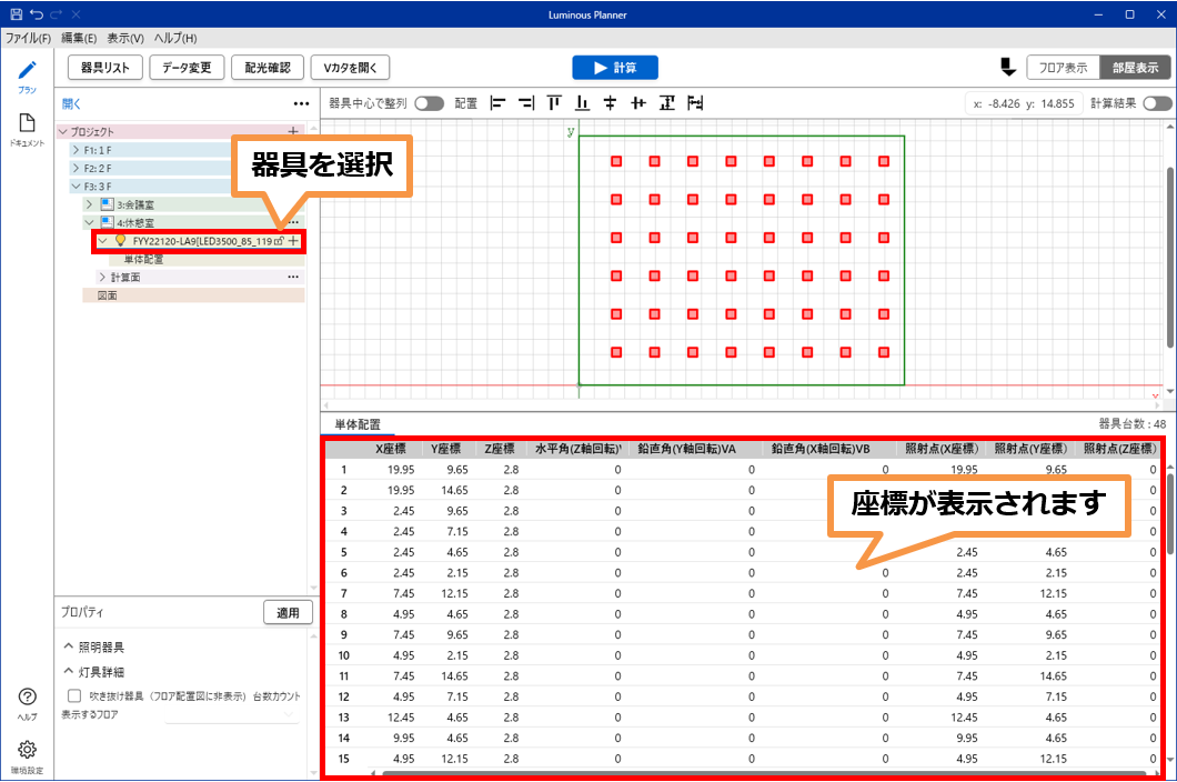 - ツリーより高さを変更したい器具を選択すると座標が表示されます。