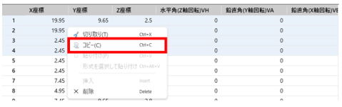 座標画面に選択した器具座標が青く表示されます。右ボタンクリックの[コピー]を選択します。